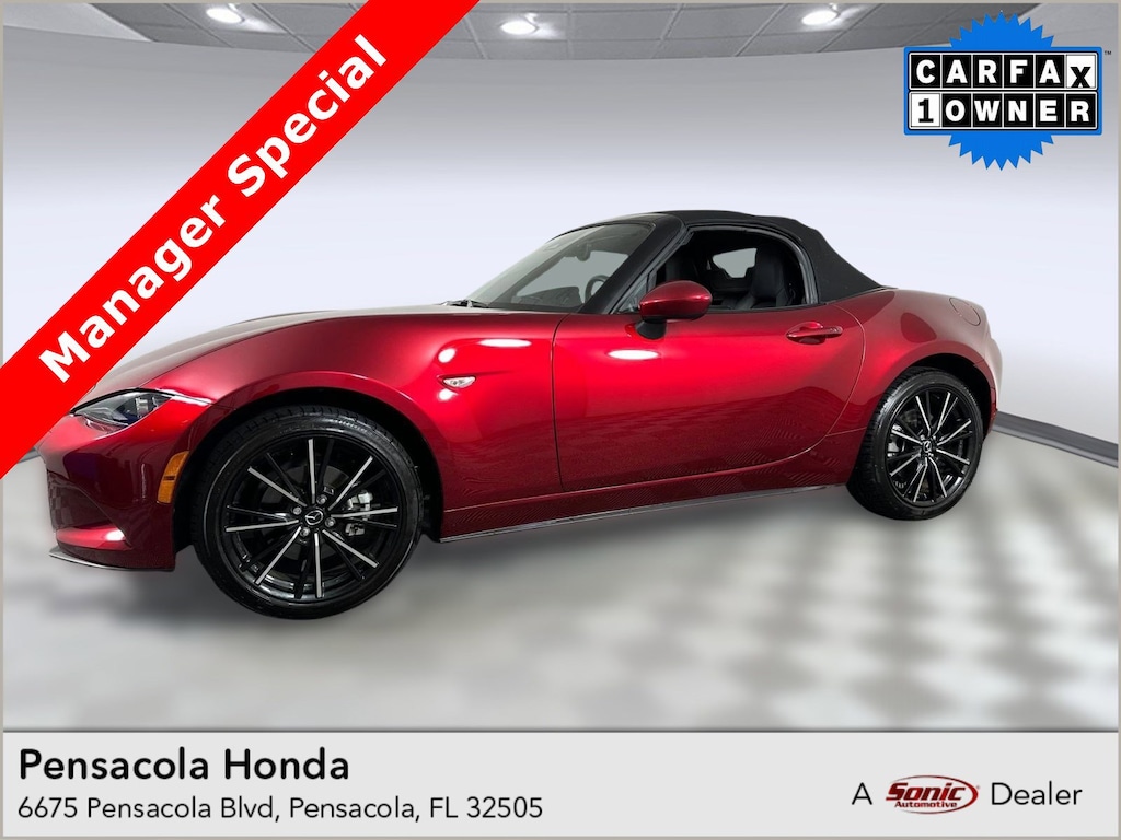 WHEEL LOCKS, SOUL RED CRYSTAL METALLIC, CARGO NET, Trunk Rear Cargo Access, Trip computer, Transmission: SKYACTIV-MT 6-Speed Manual -inc: short throw shifter, Tires: 205/45R17 High-Performance Summer, Tire mobility kit, Sport Tuned Suspension, Sport Leather/Metal-Look Steering Wheel. This Mazda MX-5 Miata has a strong Premium Unleaded I-4 2.0 L/122 engine powering this Manual transmission.
